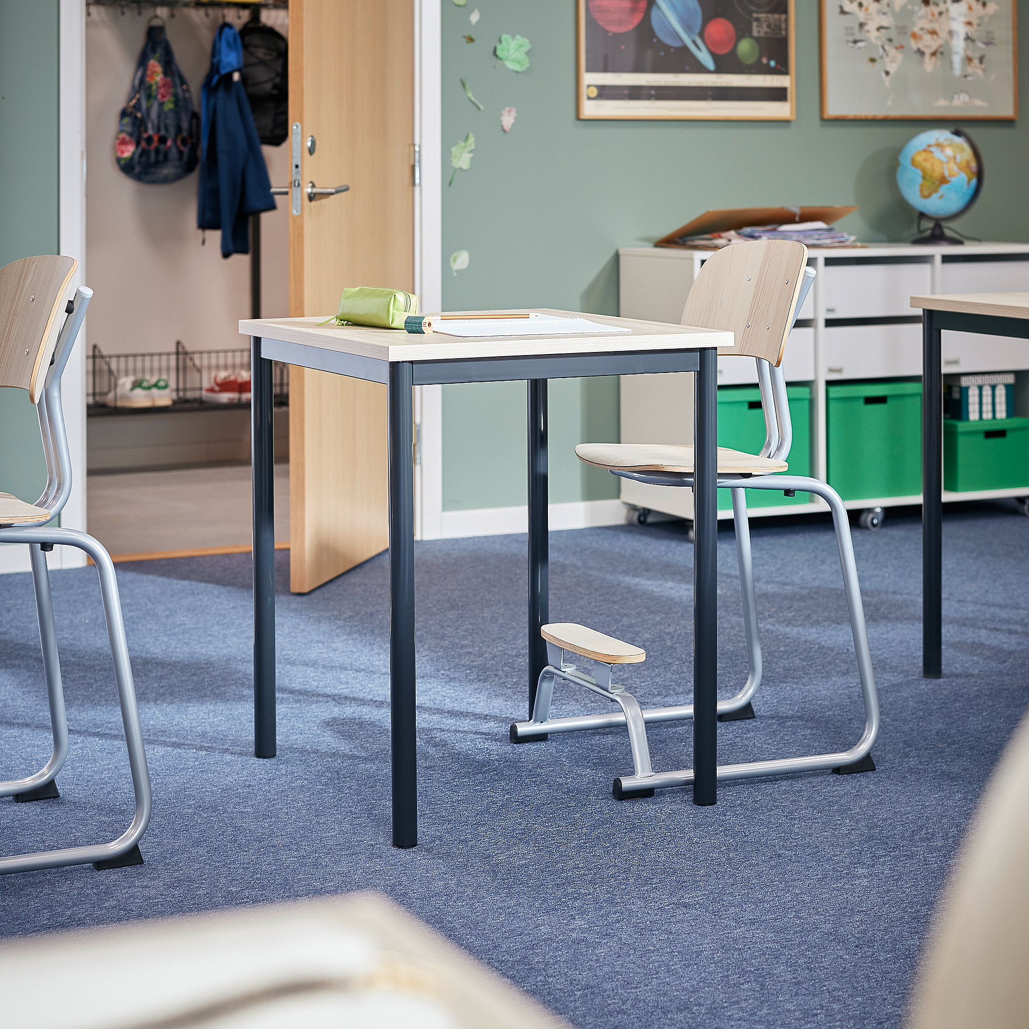 Istnieje wiele czynników powodujących wysoki poziom hałasu w klasie. Szuranie krzesłami, zamykanie szuflad i głośne odgłosy to tylko kilka przykładów codziennych hałasów. Hałas i głośne dźwięki są odbierane jako stresujące i mogą negatywnie wpływać na koncentrację uczniów i personelu. Biurko szkolne SONITUS PLUS tworzy lepsze środowisko akustyczne w szkołach, ponieważ jest wyposażone w doskonały dźwiękochłonny blat.